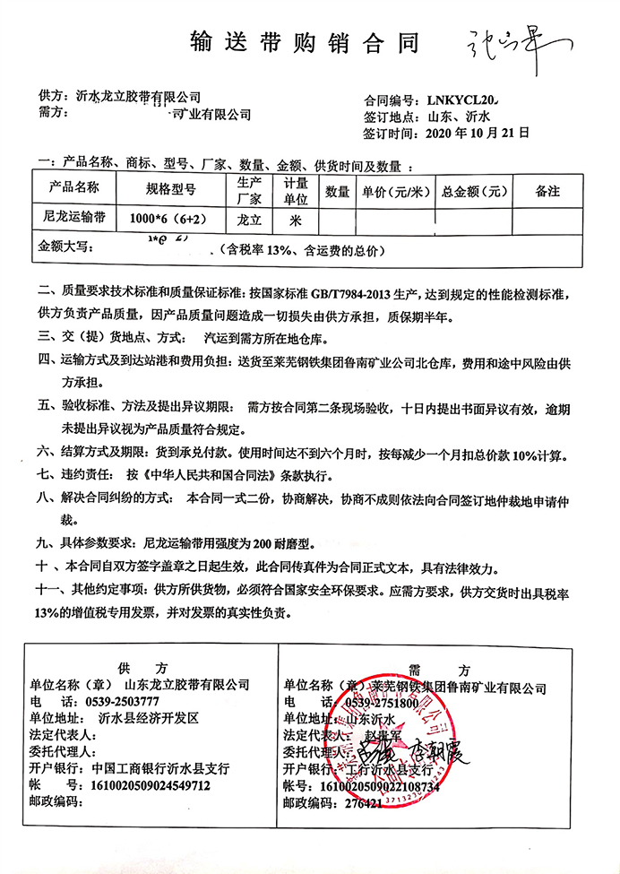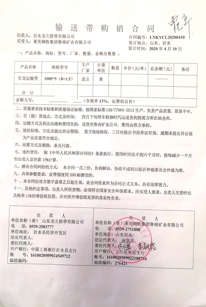 截止2021年5月底,共有11家國內外礦山大型合作客戶:山東黃金、中國鋁業(yè)、魯南礦業(yè)、臨礦集團、山東能源,鞍山礦業(yè)等。采購類型有:尼龍輸送帶、聚酯輸送帶和鋼絲繩芯輸送帶。